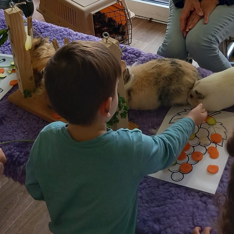 Les séances de médiation par l'animal permettent d'aborder des thématiques telles que le respect du vivant, etc...